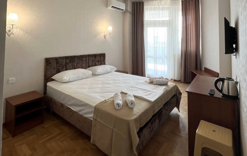 В номере: две 1-спальные кровати (можно соединять), прикроватные тумбочки, шкаф, туалетный стол, стул, кондиционер, телевизор, холодильник.