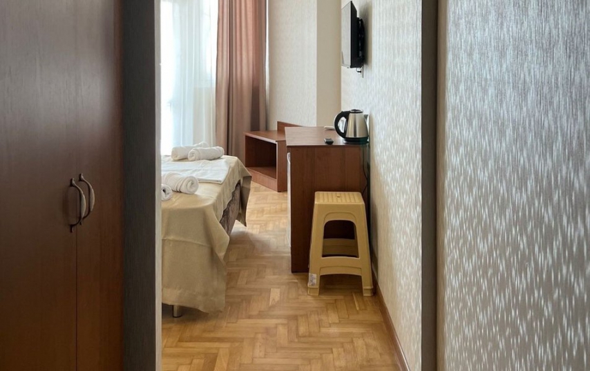 Интерьер номера выдержан в бежевых и коричневых тонах. Номер качественной оборудован и меблирован, есть выход на балкон. Окна номера выходят на ухоженную территорию санатория и горы.